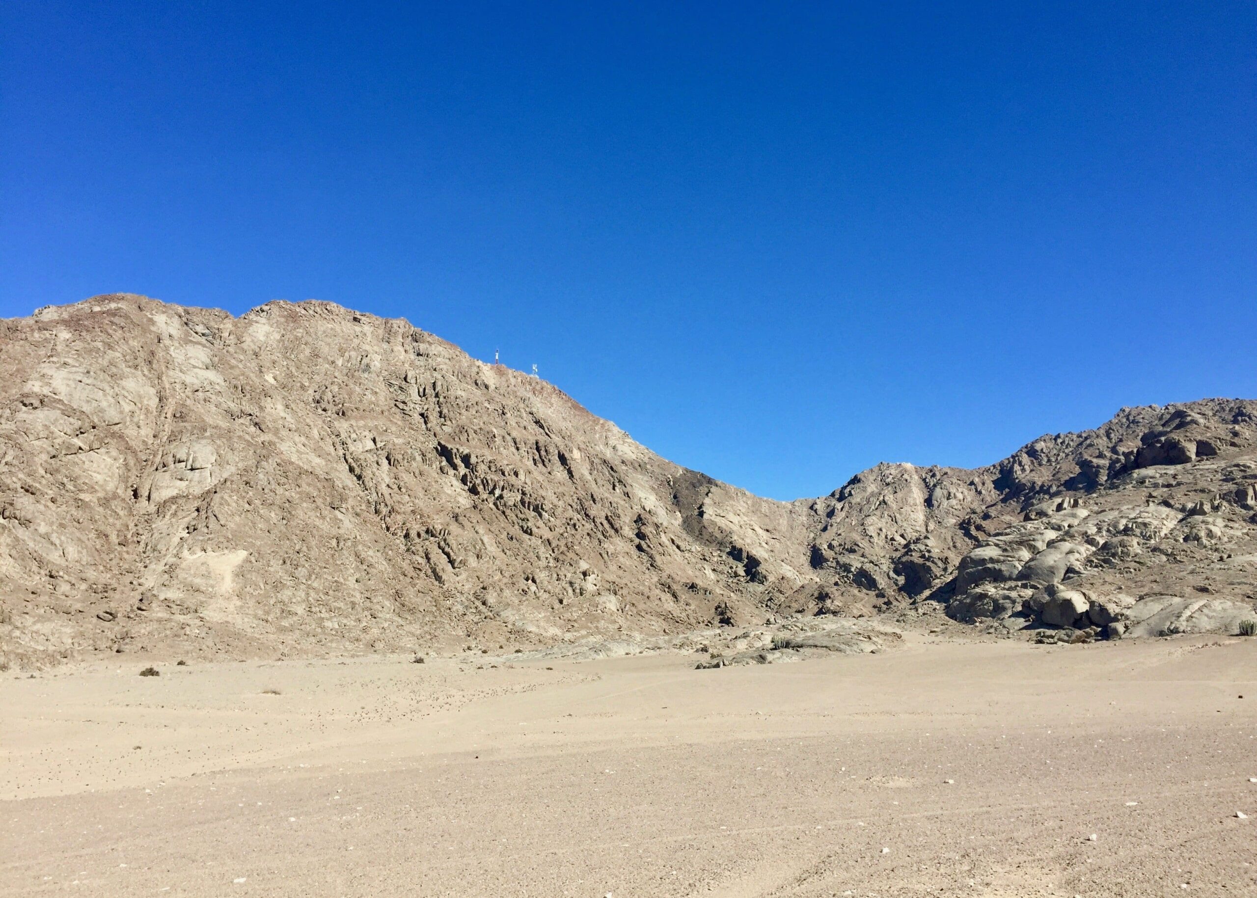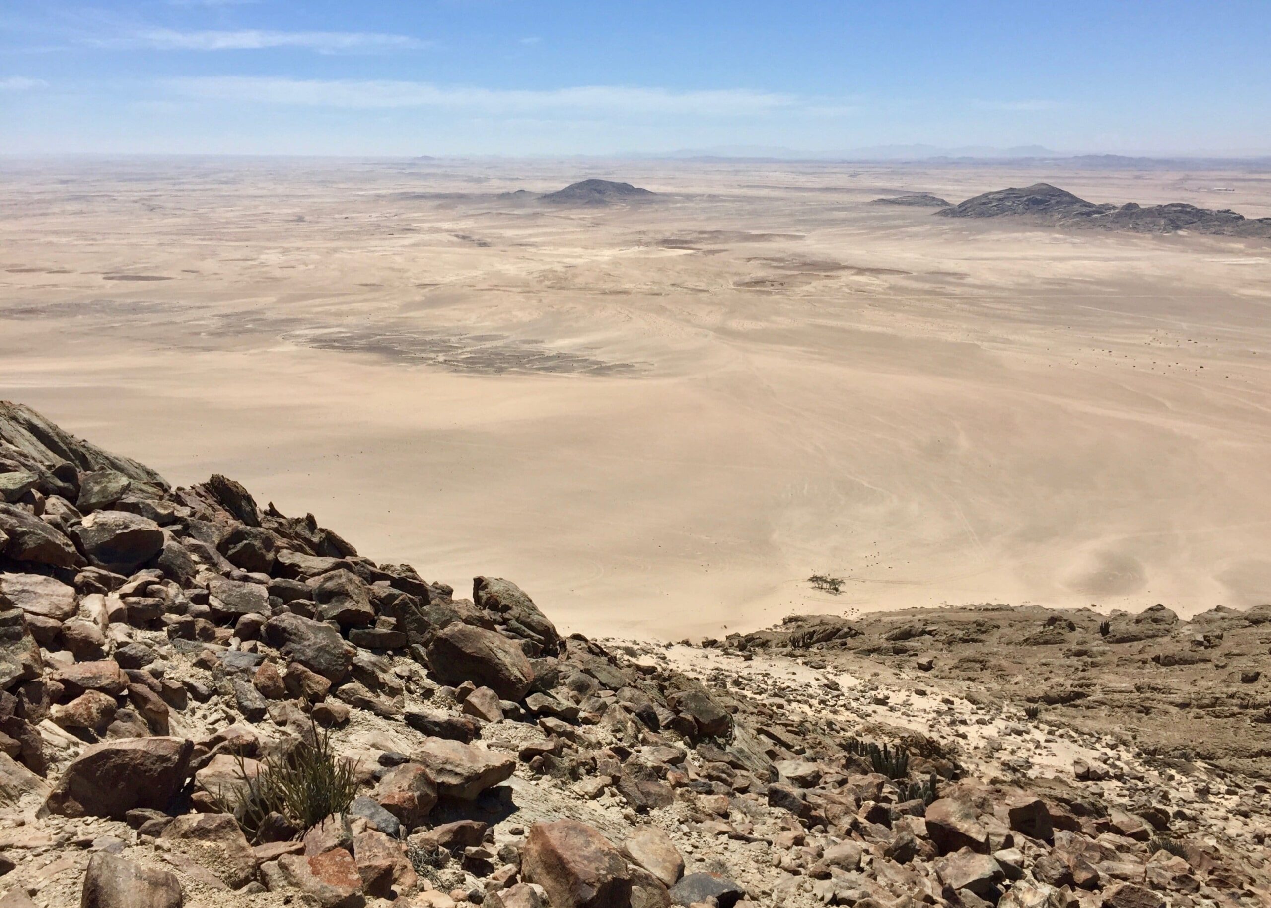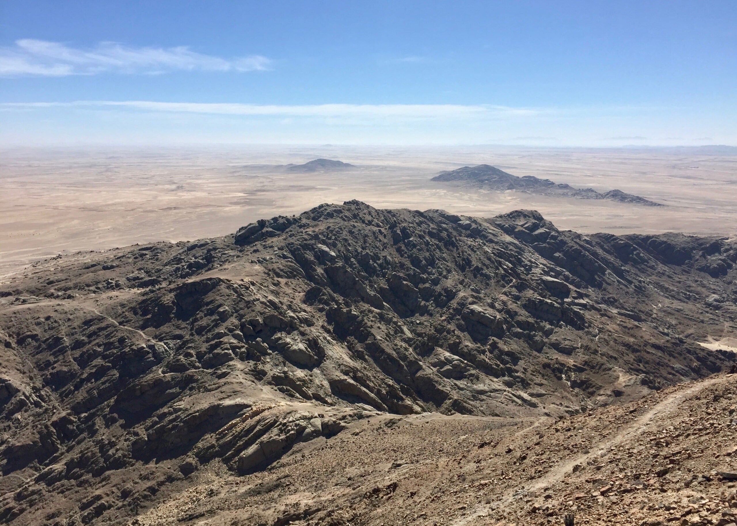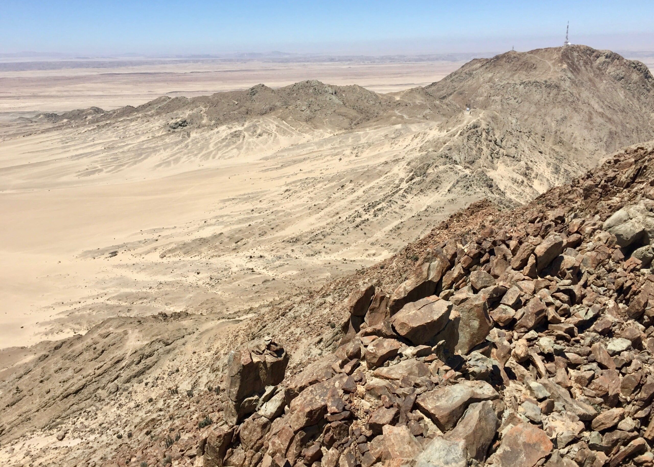 It’s been awhile, but I finally got out in the desert again recently, climbing the peaks of Rössingberge, 20km from Arandis. It’s the tallest range in the area, viewable from my front porch, and has been a target of mine since I arrived last June. Fellow PCV Eric visited from nearby Karibib and we hitchhiked to the access road off the main B2 Highway. There were trails to two of the peaks but we found ourselves scrambling up scree slopes and along ridges of loose rocks to the others.