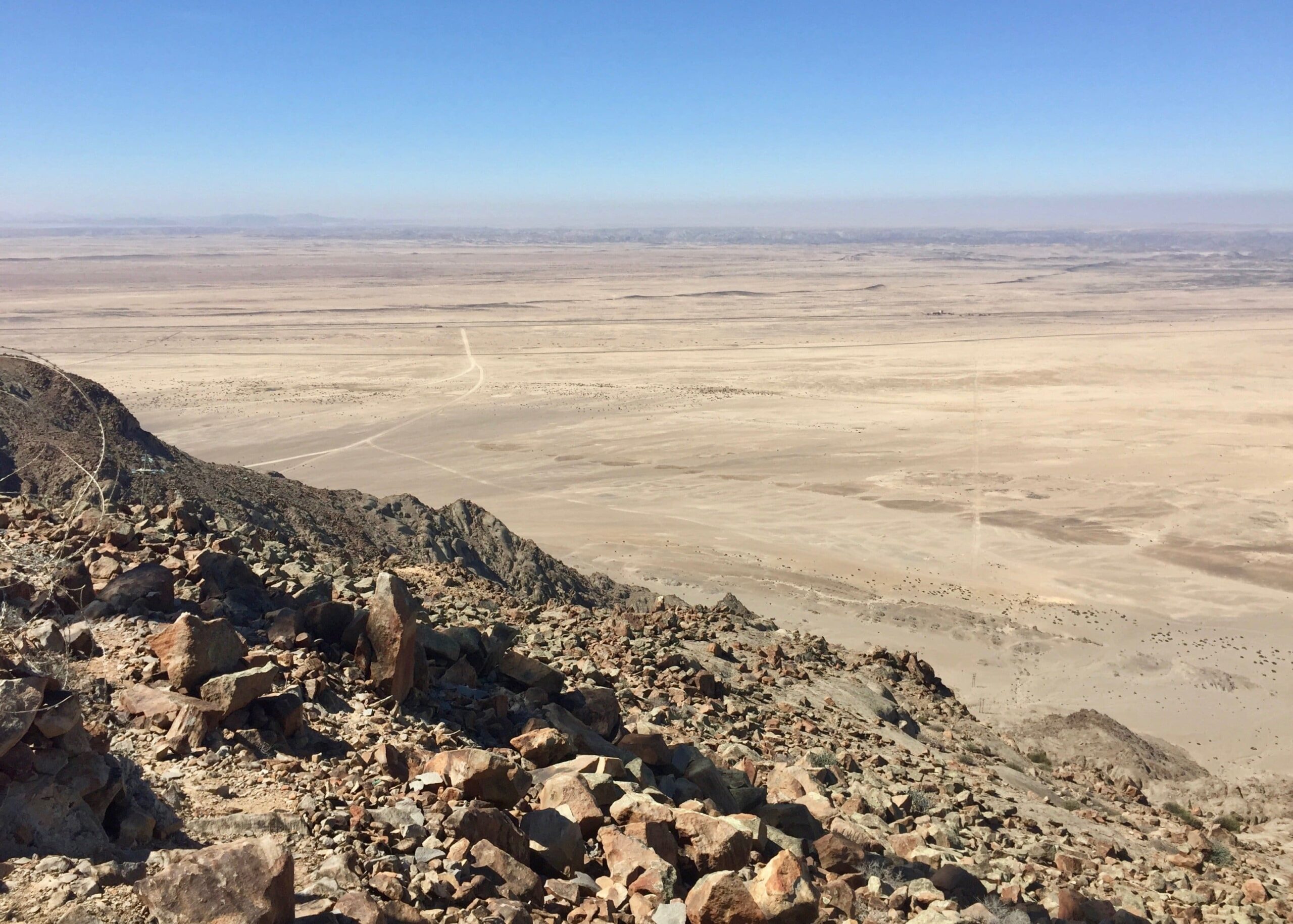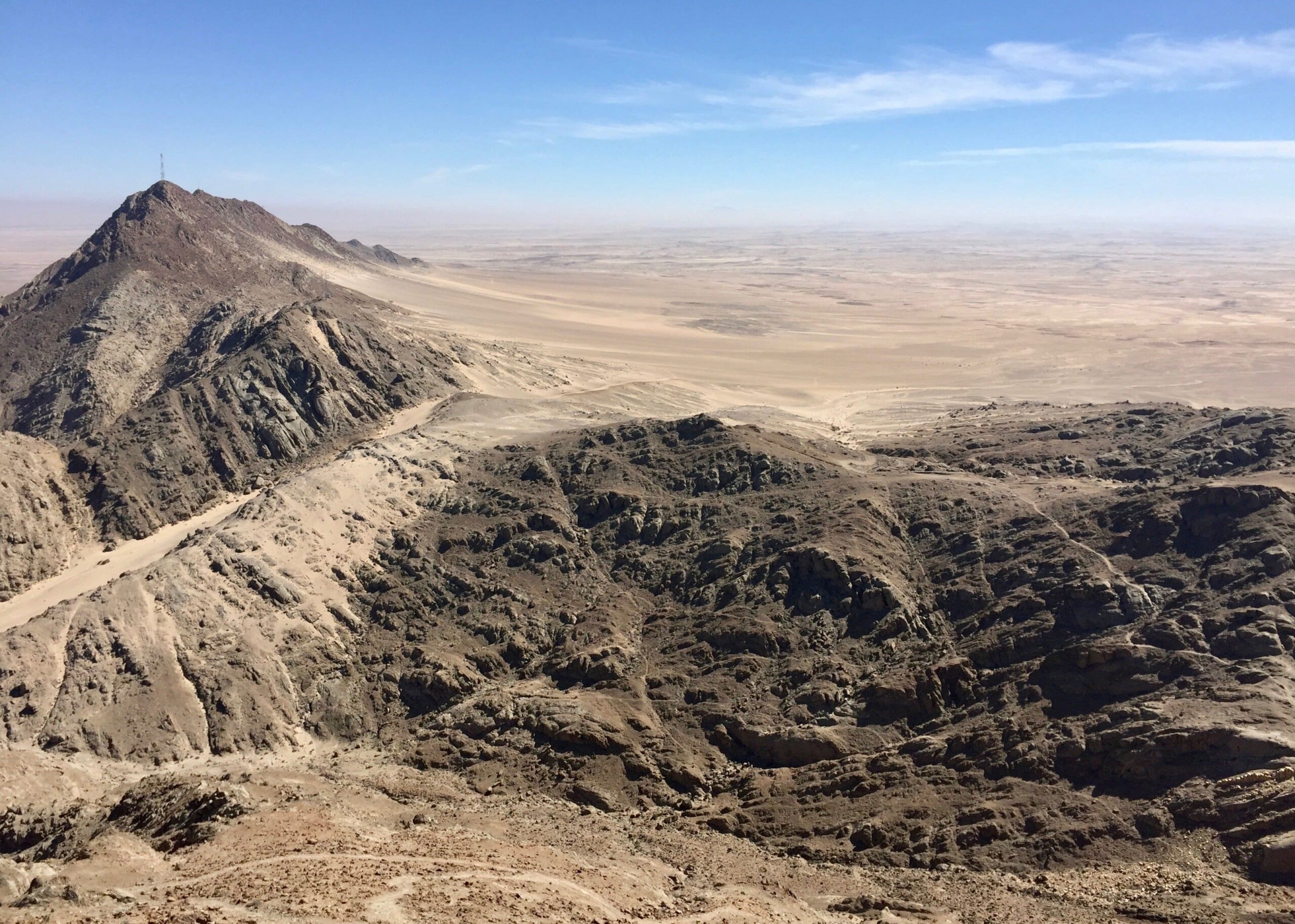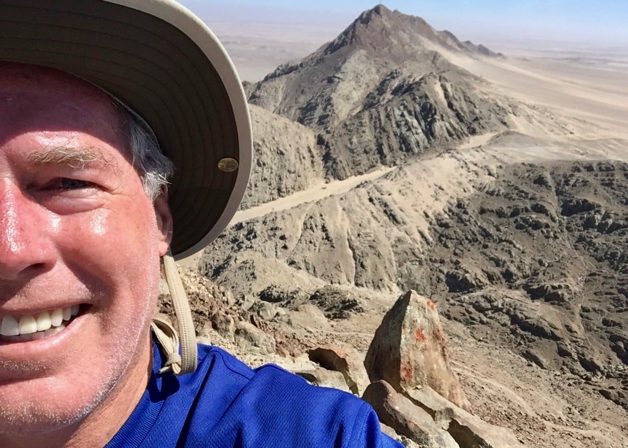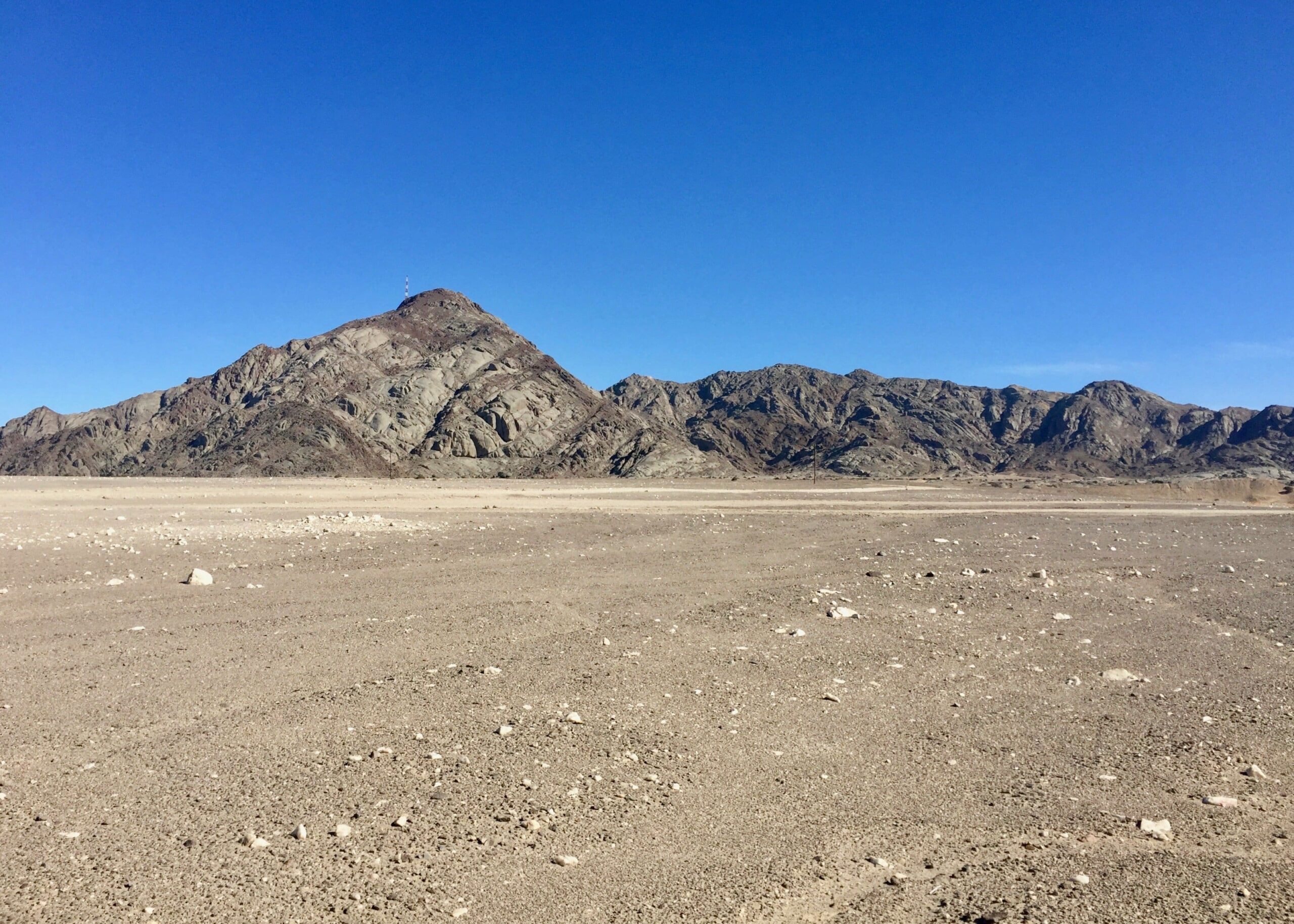 It’s been awhile, but I finally got out in the desert again recently, climbing the peaks of Rössingberge, 20km from Arandis. It’s the tallest range in the area, viewable from my front porch, and has been a target of mine since I arrived last June. Fellow PCV Eric visited from nearby Karibib and we hitchhiked to the access road off the main B2 Highway. There were trails to two of the peaks but we found ourselves scrambling up scree slopes and along ridges of loose rocks to the others.
