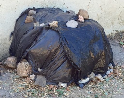Today we learned about perma-gardening and made this 1-meter cube compost pile. Beneath the plastic bag covers (used to reduce evaporation), are a mix of green and brown debris, ash and manure collected from around our training center. In arid Namibia, such material is hard to come by!