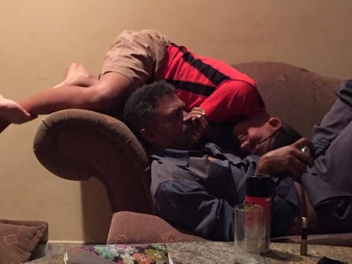 Meanwhile, back at home at the end of the day: Damien wants to wrestle while Baai just wants to relax in front of the TV.