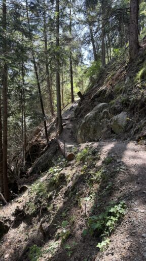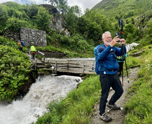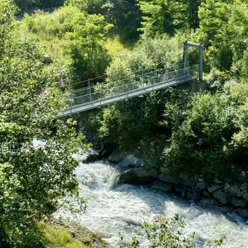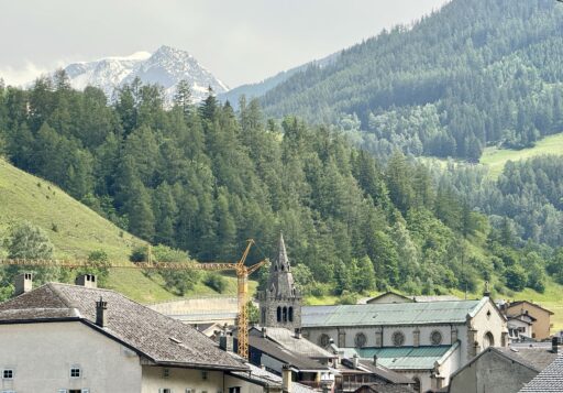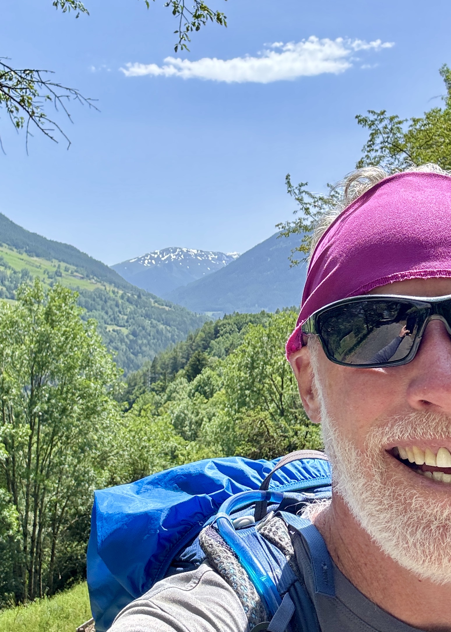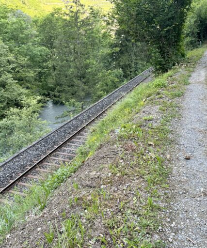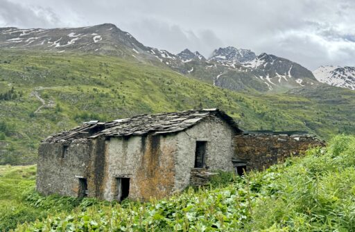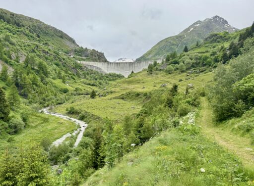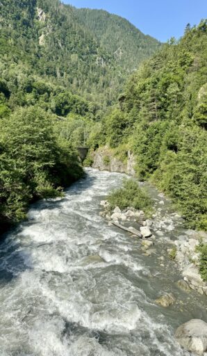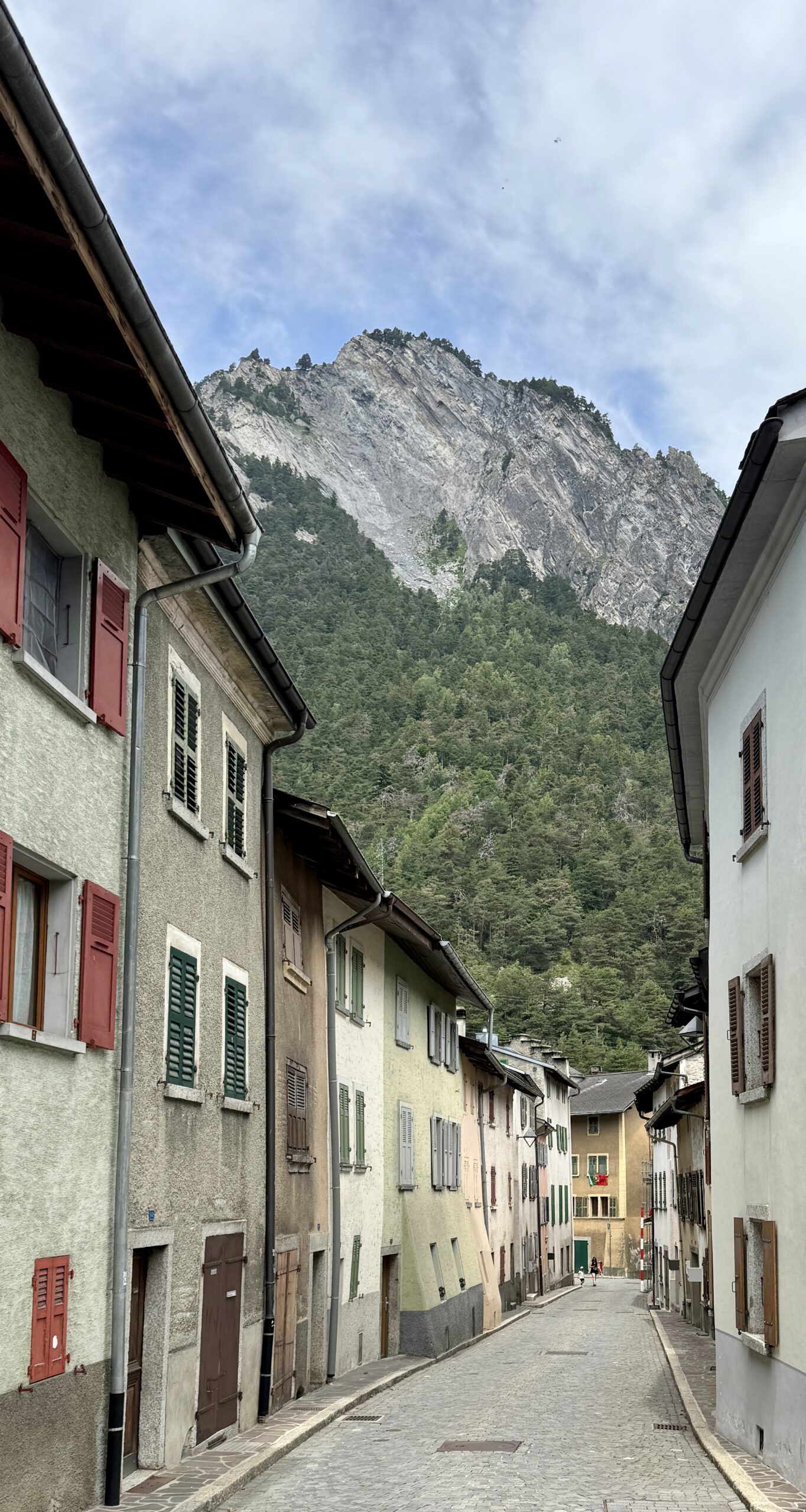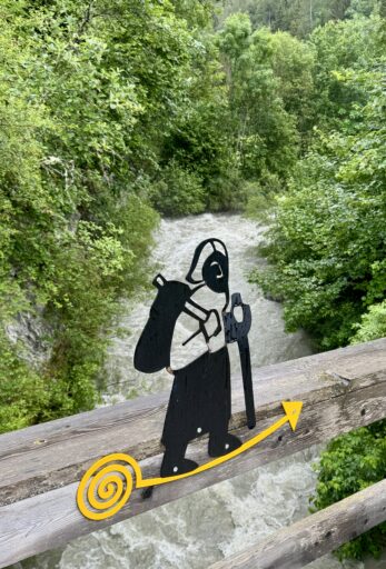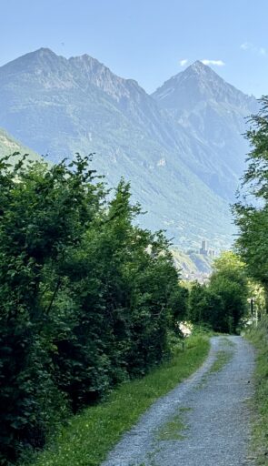 A full day of climbing. Up two canyons surrounded by high granite peaks. The first was a narrow gorge that Sandy Brown’s guidebook called the most difficult stretch of the entire Via Francigena (I wouldn’t refute that – at one point, the trail had been wiped out by a recent landslide down to the river, but an alternate has been developed). The second canyon was much wider: glacier-formed. It’s good that I like to climb, because I have more of it to come in the next two stages.